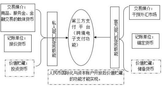 跨境电子支付(Cross-border Payment)指两个或者两个以上国家或者地区之间因国际贸易、国际投资及其他方面所发生的国际间债券债务借助一定的结算工具和支付系统实现资金跨国和跨地区转移的行为。如中国消费者在网上购买国外商家产品或国外消费者购买中国商家产品时,由于币种的不一样,就需要通过一定的结算工具和支付系统实现两个国家或地区之间的资金转换,最终完成交易。 支付机构跨境外汇支付业务:支付机构跨境外汇支付业务是指支付机构通过银行为电子商务(货物贸易或服务贸易)交易双方提供跨境互联网支付所涉的外汇资金集中收付及相关结售汇服务。 从职能方面来说,国际货币在私人部门与政府职能部门分别承担着记账单位、交易媒介和价值储存的三大功能。跨境电子支付与这三种功能均密切相关。货币国际化的过程一般是从结算货币、投资货币再到储备货币(国际货币的职能见图1)。 跨境电子支付主要与私人和官方部门中的交易媒介、记账单位两大功能有较紧密的联系。第三方支付平台通过跨境电子支付功能将私人部门与官方部门的“交易”、“记账”两大职能联系起来,共同构筑跨境人民币贸易结算的新平台,因此必要对跨境电子支付的相关内容进行梳理。