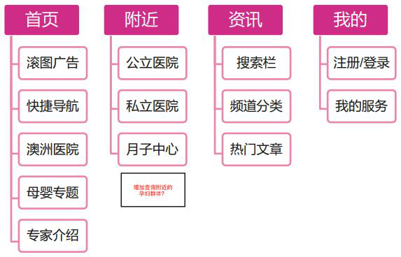 1.市场需求 为繁忙的华人用户提供个性化的产妇科医疗服务,成为客户孕产期间的助手。 简化澳洲当地的医疗信息渠道,让客户真正可以自由选择私人或是公立医疗的服务。 为客户提供权威的专业知识作为产品的内容。 成为当地专科妇产服务的一个可信的广告平台。 2.产品功能 PC, 微信和APP三大平台,数据共享。